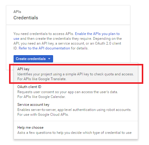 - Select the Credentials tab, click the Create credentials button and select API Key