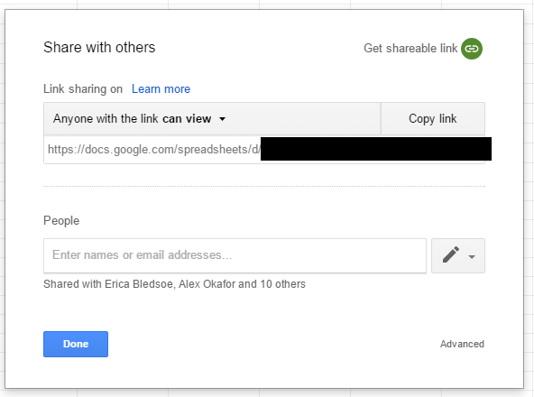 - Set the Permission to who you’d like to INPUT data to the sheet. Add the people you want to participate in updating their stats.